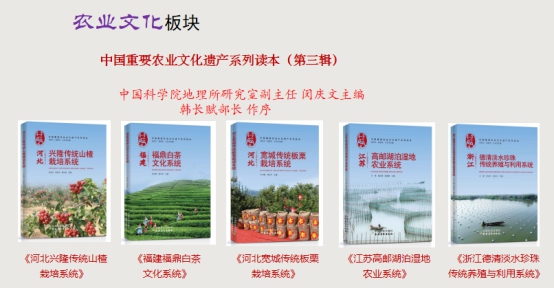 该板块19年出版了中国重要农业文化遗产系列读本(第三辑)5种图书,该系列主编是中国科学院地理所研究室副主任闵庆文先生,由农业农村部韩长赋部长作序。该系列之前还出过第一辑和第二辑,分别都有11个品类。