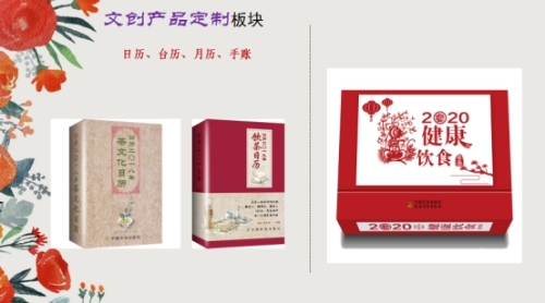 我们出版了日历、台历、月历、手账等文创产品,今年新推出一本健康饮食台历,是以一周为一面,可以摆放在桌面上,每周介绍一个饮食小常识并配有记事工作簿,方便实用。还有一本新出的2020年月历,可以挂在墙上方便使用。我们非常欢迎相关的私人定制,希望可以一起开发合作更多丰富的文创产品。